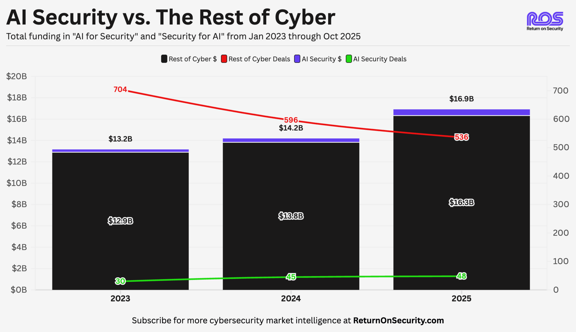 Year | AI Security $ | AI Security Deals | All Others $ | All Other Deals |