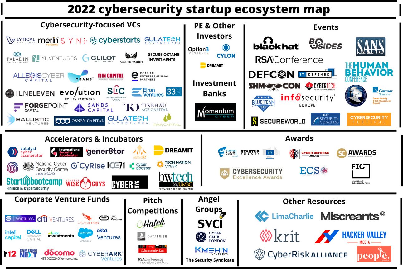 The 2022 cybersecurity ecosystem map featuring 22 VCs, one investment bank, 13 corporate venture capital firms and 4 angel groups. Source: Global cybersecurity startup ecosystem map: a founder’s guide.