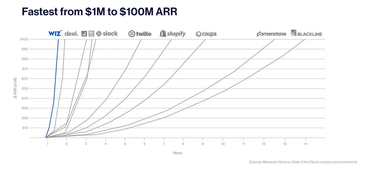 While cybersecurity is not well positioned for blitzscaling, it does not mean that blitzscaling in cyber isn’t possible. One of the companies that defied this limitation is Wiz which hit $100M ARR in 18 months becoming the fastest-growing software company.