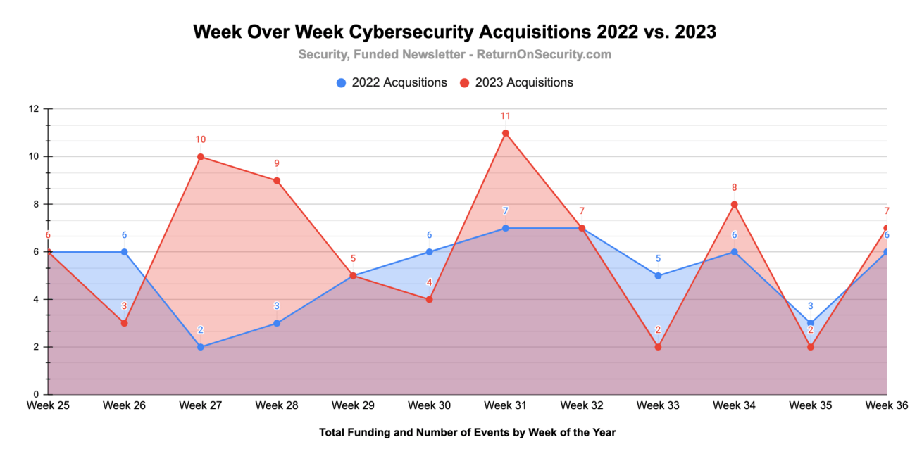 A rolling 12-week chart to compare funding and acquisitions each week between 2022 and 2023.