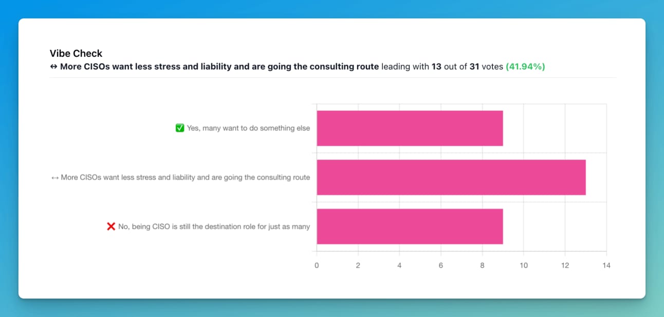61% of respondents said they thought that more CISOs either want less stress or want to do something completely different. While it’s still an undeniable destination role for many people, you can’t ignore the systematic signs of stress that this role has taken on in the last 2-3 years.
