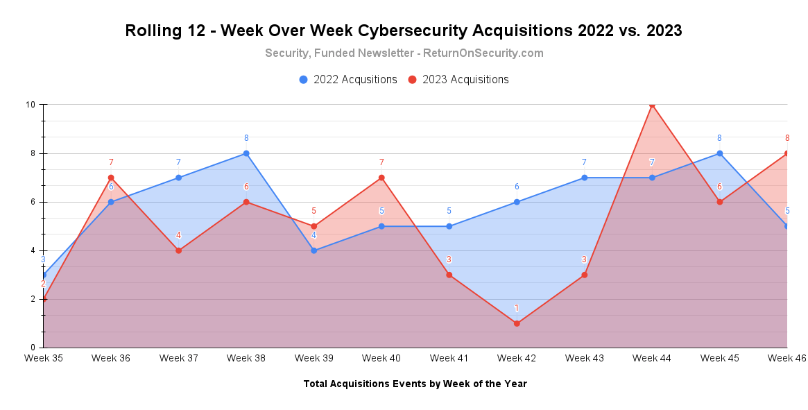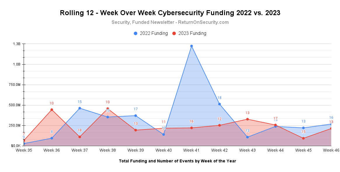 A healthy week of rebounding on the funding scene last week after a much smaller-than-normal funding total the week prior. And with last week, cybersecurity deals have hit nearly $12.0B for the year or down ~38% YoY.
