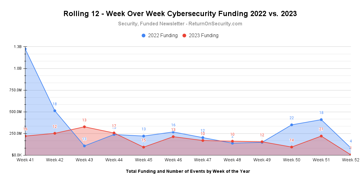 A rolling 12-week chart to compare funding and acquisitions each week in a year-over-year (YoY) view between 2022 and 2023. This week is looking at the last three weeks of December 2023 vs. the last three weeks of December 2022.