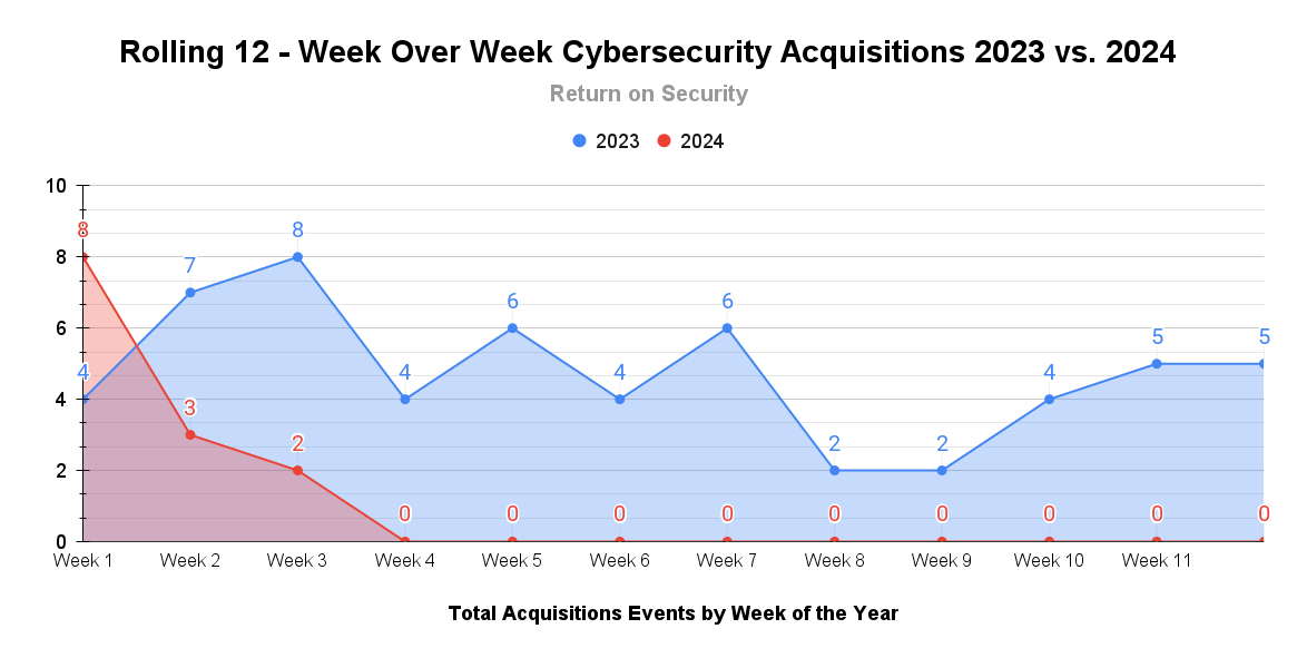 A rolling 12-week chart to compare funding and acquisitions each week in a year-over-year (YoY) view between 2023 and 2024.