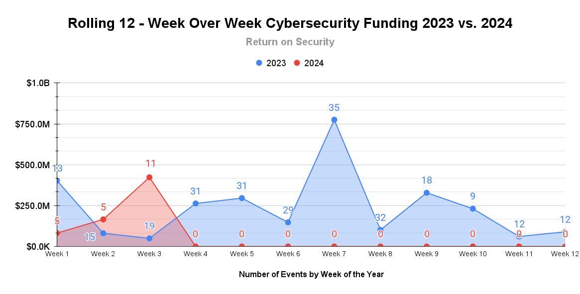A big surge in funding last week was driven mostly by quantum computing and security, a capital-hungry and emerging field in cyber. A significant drop in transaction volume is starting to emerge at the start of the year with far fewer transactions than in 2023 at this time.