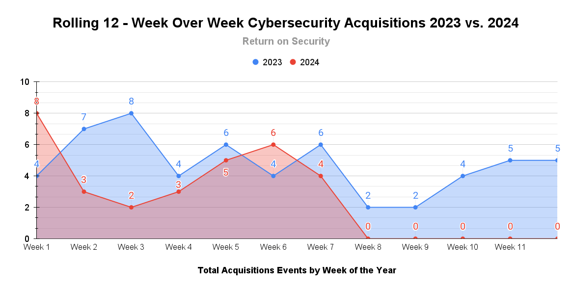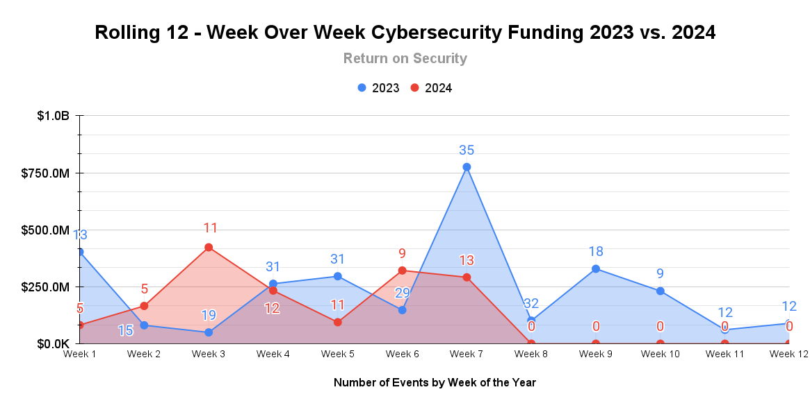 A rolling 12-week chart to compare funding and acquisitions each week in a year-over-year (YoY) view between 2023 and 2024.