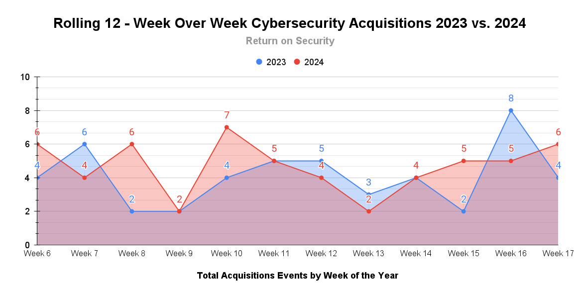 This is a rolling 12-week chart comparing funding and acquisitions each week in a year-over-year (YoY) view between 2023 and 2024.