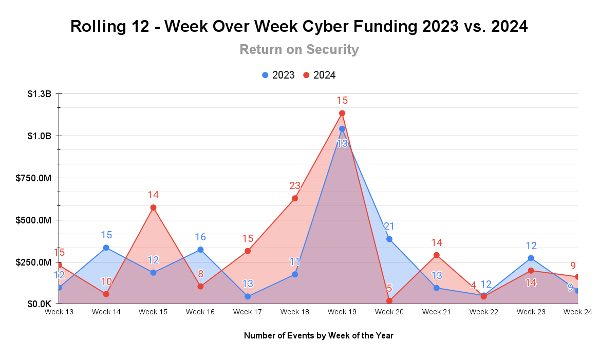 This is a rolling 12-week chart comparing funding and acquisitions each week in a year-over-year (YoY) view between 2023 and 2024.