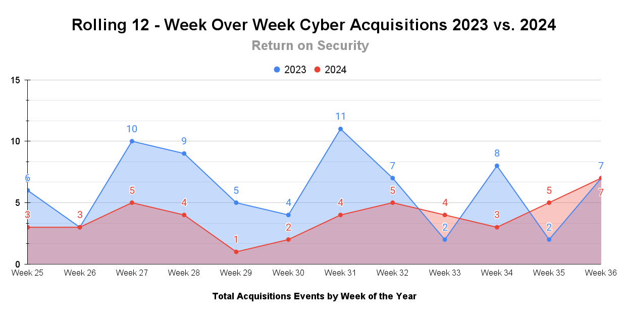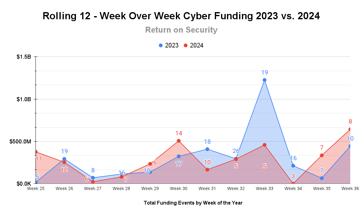 This is a rolling 12-week chart comparing funding and acquisitions each week in a year-over-year (YoY) view between 2023 and 2024.