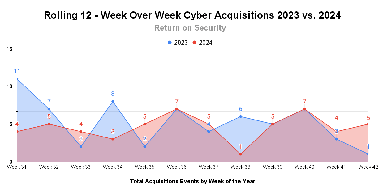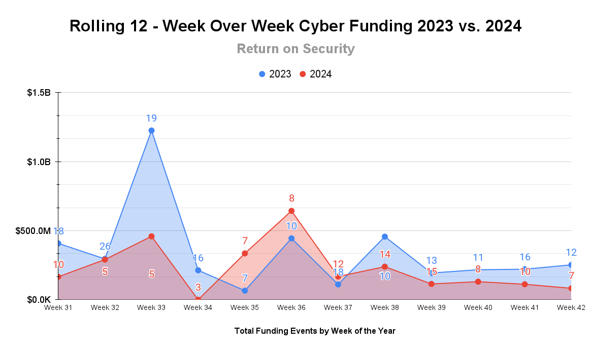 This is a rolling 12-week chart comparing funding and acquisitions each week in a year-over-year (YoY) view between 2023 and 2024.