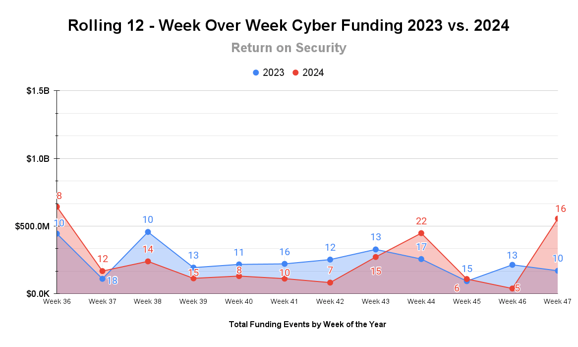 A huge bump in funding last week compared to the past several weeks, most of which came from later-stage funding. With last week under our belt, cybersecurity funding for 2024 has surpassed $12 billion YTD.