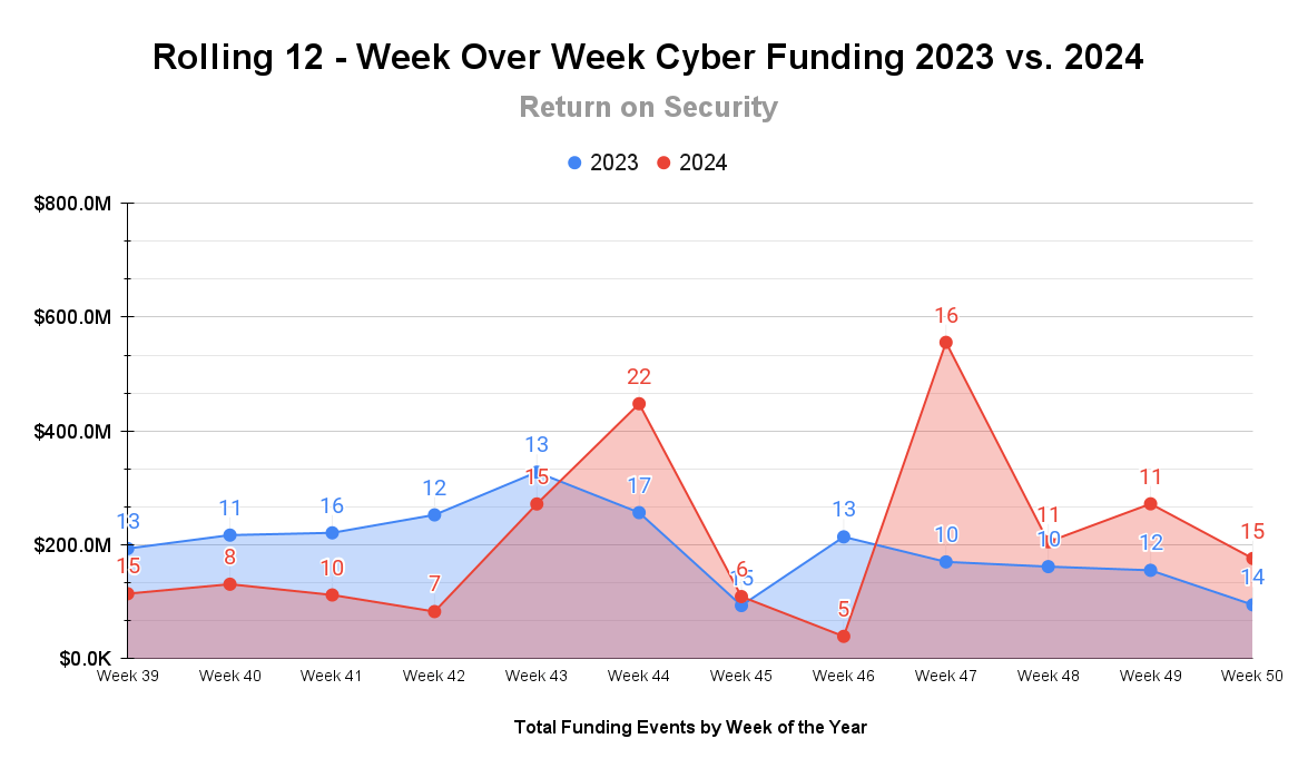 This is a rolling 12-week chart comparing funding and acquisitions each week in a year-over-year (YoY) view between 2023 and 2024.