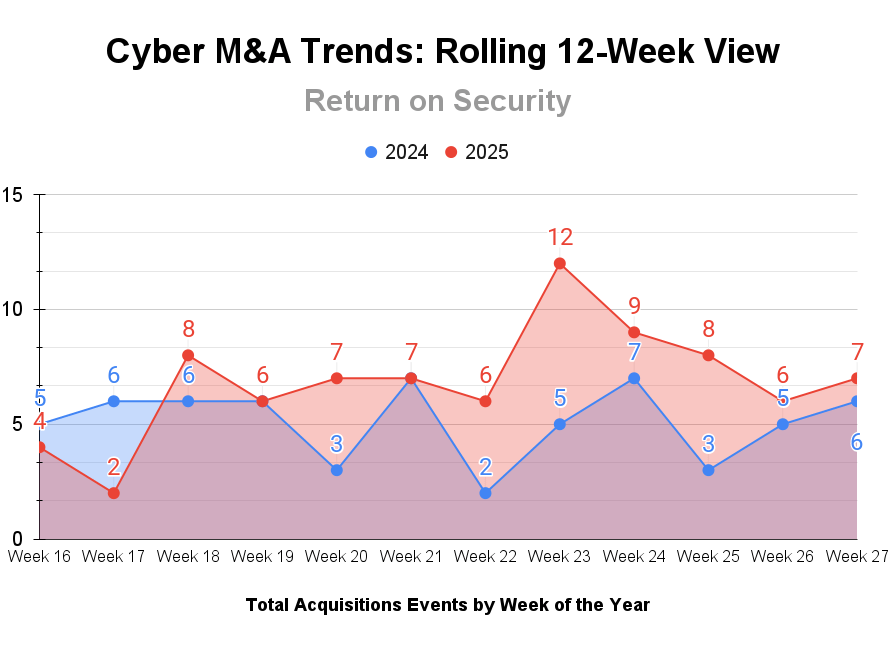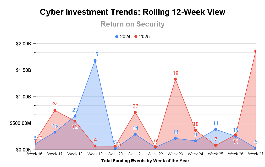 Rolling 12-week charts that compare funding and acquisitions weekly in a year-over-year (YoY) view between 2024 and 2025.
