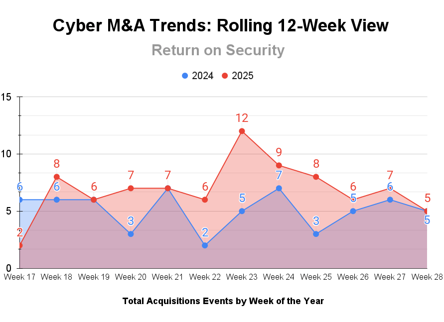 Rolling 12-week charts that compare funding and acquisitions weekly in a year-over-year (YoY) view between 2024 and 2025.