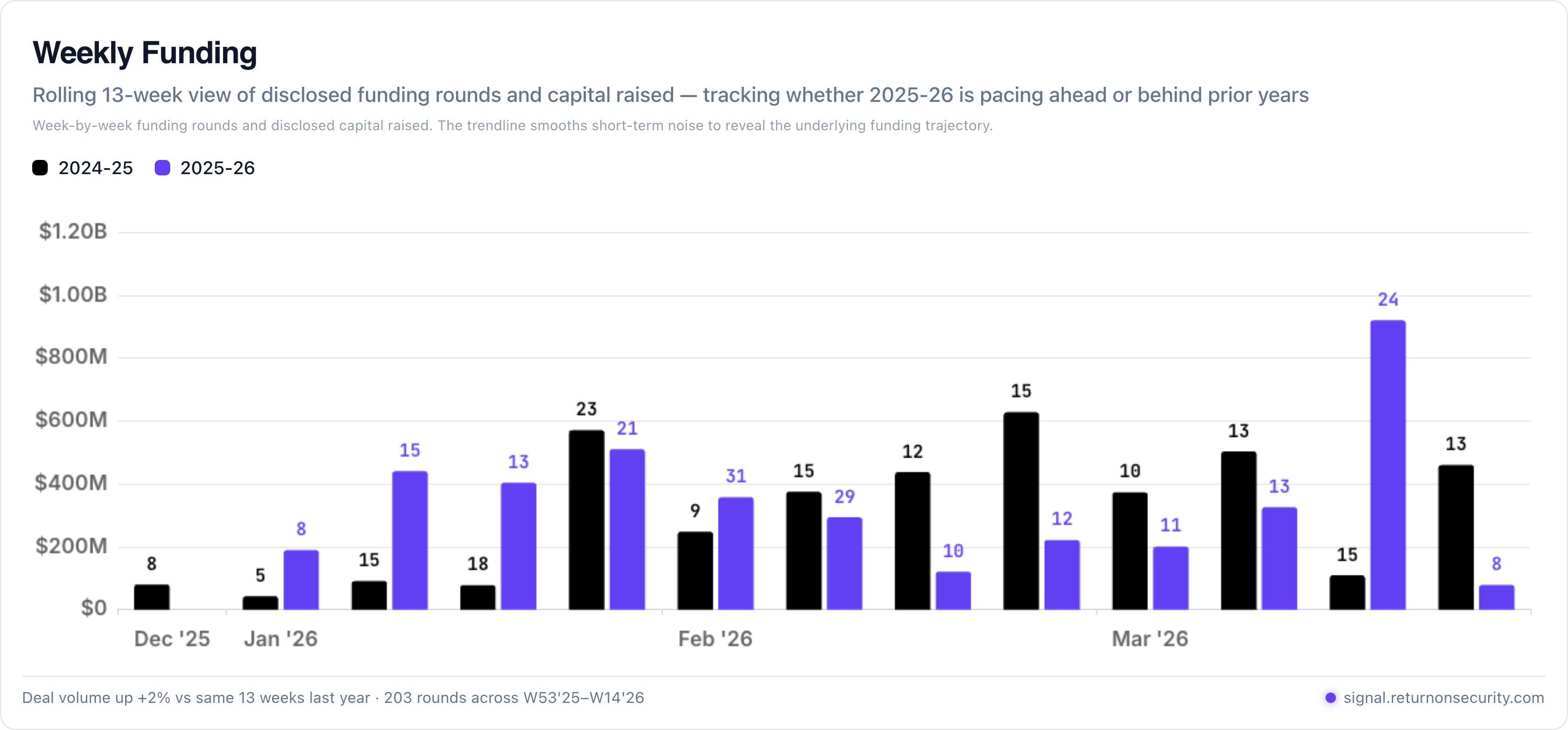 Rolling 13-week charts that compare funding and acquisitions week over week, year over year, comparing the end of 2024 vs. 2025 with the start of 2025 vs. 2026.